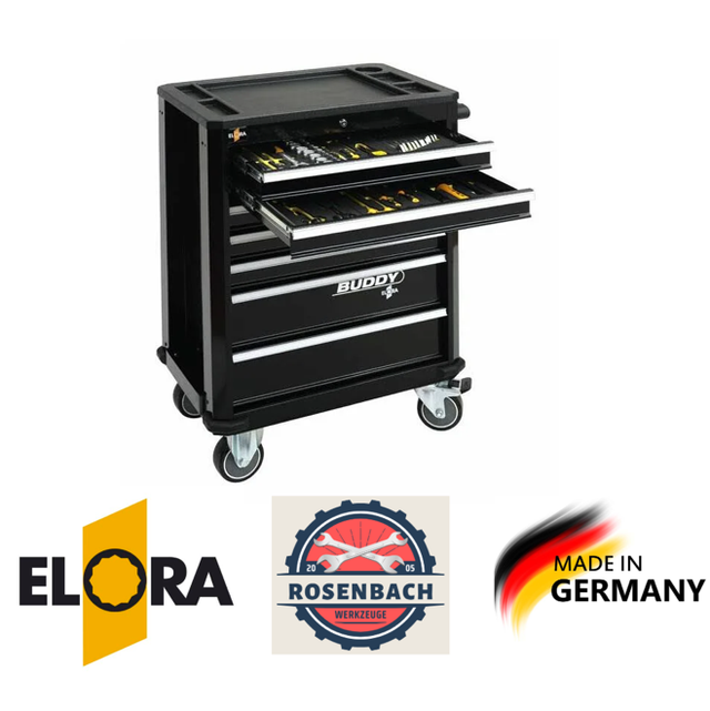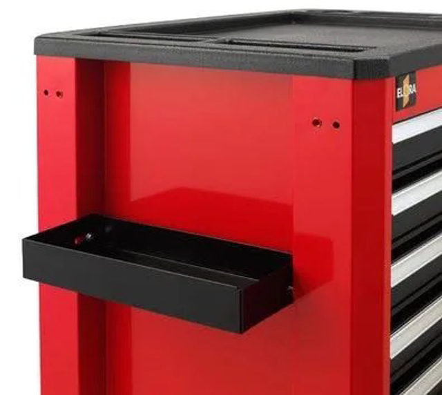 in den zurückgesetzten Seitenwänden können 6 Zubehörteile wie Ablagefächer für Kleinteile ELORA-Nr. 1210-ES und Schraubendreher-Ablagen für 8 Schraubendreher ELORA-Nr. 1210-SD befestigt werden