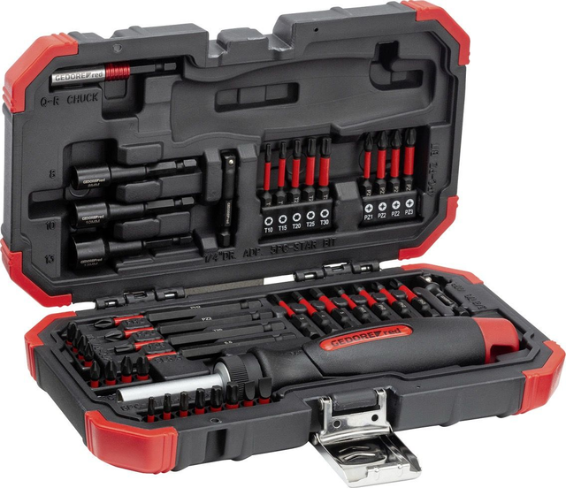 Der Gedore Torsions-Bit-Satz, bestehend aus 43 Teilen, bietet eine vielseitige Auswahl an Bits für verschiedene Anwendungen. Enthalten sind ein magnetischer Knarren-Bitschraubendreher, 36 Torsions-Bits in den Profilen PH, PZ, SL, IN, TX in den Längen 25 mm, 50 mm und 90 mm sowie magnetische Steckschlüsseleinsätze in den Größen SW 8, 10 und 13. Zusätzlich sind ein praktischer 1/4" Schnellwechseladapter sowie ein 1/4" und 3/8" Antriebsadapter enthalten. Der gesamte Satz wird in einem handlichen Kunststoffkoffer im GEDORE red Design geliefert, der eine praktische Aufbewahrung ermöglicht. Ideal für den professionellen Einsatz und vielseitige Anforderungen.