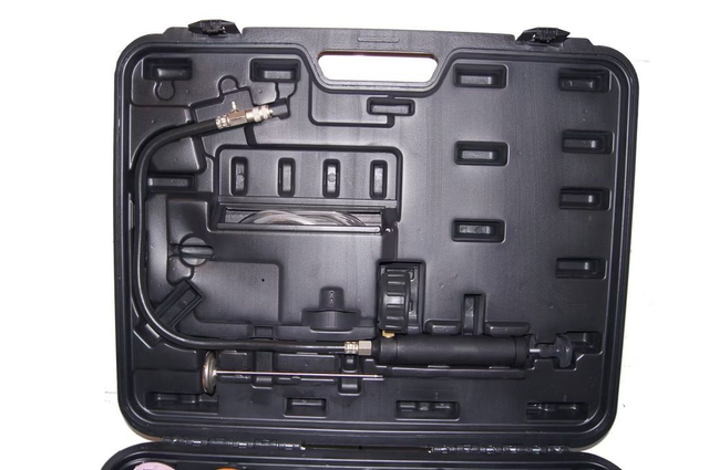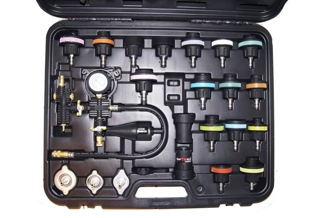 Kühlsystem-Abdruck und Prüfgerät, 24-teilig Marke Kraftwelle, Artikelnummer S-25PT Abdrückgerät zum Prüfen als auch Befüllen von Kühlsystemen, passend für alle gängigen Fahrzeugtypen Handpumpe erzeugt über fahrzeugspezifische Adapter auf dem Kühler bzw. Ausgleichsbehälter einen Überdruck im System und lässt per Druckanzeige Dichtigkeit prüfen aufgrund Überdruck im System können so bei Druckverlust Leckagen per Sichtprüfung gefunden werden gemessener Druck kann mit Standartwerten des Kühlerdeckels verglichen werden Befüllen mit Hilfe von Druckluft Vakuum Pumpen-Einheit enthalten sind ein Thermometer bis 200°C Kühlerdruck Testpumpe mit Druckanzeige von 0 bis 2.5 bar (Toleranz +-2%) Druckluft Vakuum Pumpen-Einheit mit Ventilen, Anschlüssen und Druckanzeige ein Verbindungsstück R 123/R 124, ein Verbindungsstück R 123/R 125 ein Adapter für Mercedes-Benz (W123, W124, W126 und W201), GM, Buick und Jeep ein Adapter für Peugeot, Subaru, Chrysler, Acura, GM, Mitsubishi, Nissan,