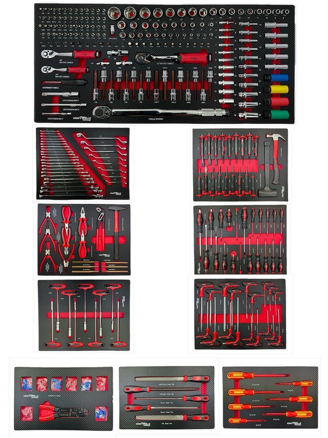 Umfangreiches Werkzeugset: Dieser Werkzeugwagen wird mit einem umfassenden Werkzeugset geliefert, 10 der 12 Schubladen sind befüllt, die Einlagen sind in hochwertiger Carbon Optik (Schaumeinlagen).