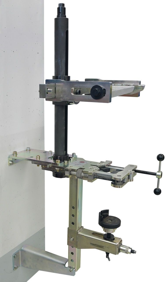 Die lange Wandhalterung ermöglicht die stabile Montage des stationären Federspanners KL-5501 B an einer senkrechten Wand.