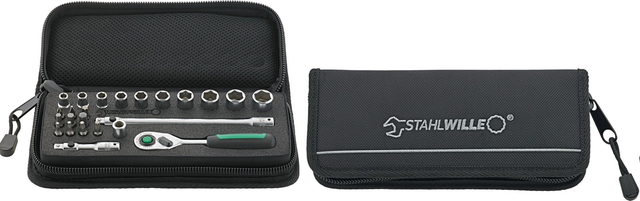 • Zusammenstellung für höchste Ansprüche: QR-Feinzahnknarre mit Verlängerungen, Steckschlüsseleinsätze bis SW 12, Bit-Halter und diverse Bits.